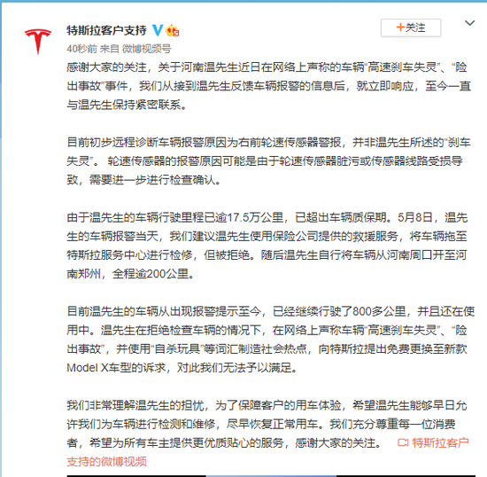 5月28日,特斯拉在微博回应河南温先生近日在网络上声称的车辆“高速刹车失灵”、“险出事故”事件,称目前初步远程诊断车辆报警原因为右前轮速传感器警报,并非“刹车失灵”。特斯拉还表示,温先生的车辆行驶里程已逾17.5万公里,已超出车辆质保期,车辆从出现报警提示至今,已经继续行驶了800多公里,并且还在使用中。温先生在拒绝检查车辆的情况下,在网络上声称车辆“高速刹车失灵”、“险出事故”,并使用“自杀玩具”等词汇制造社会热点,向特斯拉提出免费更换至新款Model X车型的诉求,对此特斯拉无法予以满足。