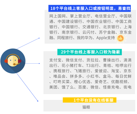 ●六成以上线上客服通道较为隐蔽,一个平台无在线客服。