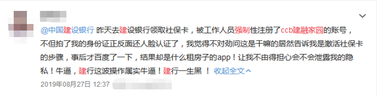除了上述网友,还不乏有人吐槽这款住房app,有网友吐槽称,“昨天去建设银行领取社保卡,被工作人员强制性注册了ccb建融家园的账号,不但拍了我的身份证正反面还人脸认证了,我觉得不对劲问这是干嘛的居然告诉我是激活社保卡的步骤,事后才百度了一下,结果却是什么租房子的app!”