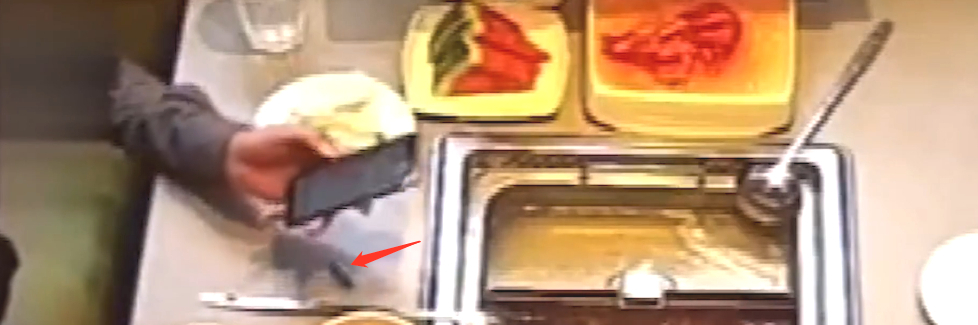 原来该客人在吃饭的时候,先是一手拿着手机,一手往锅里放食材。