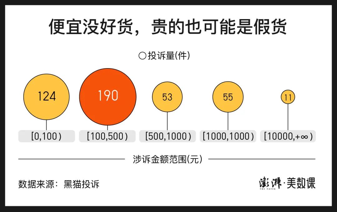电商直播能发展得如火如荼,低价是主要噱头。从黑猫投诉平台的433条投诉来看,“便宜没好货”的俗语的确得到验证——直播间假货的涉诉金额,整体不高,500元以下的商品占比在70%以上。