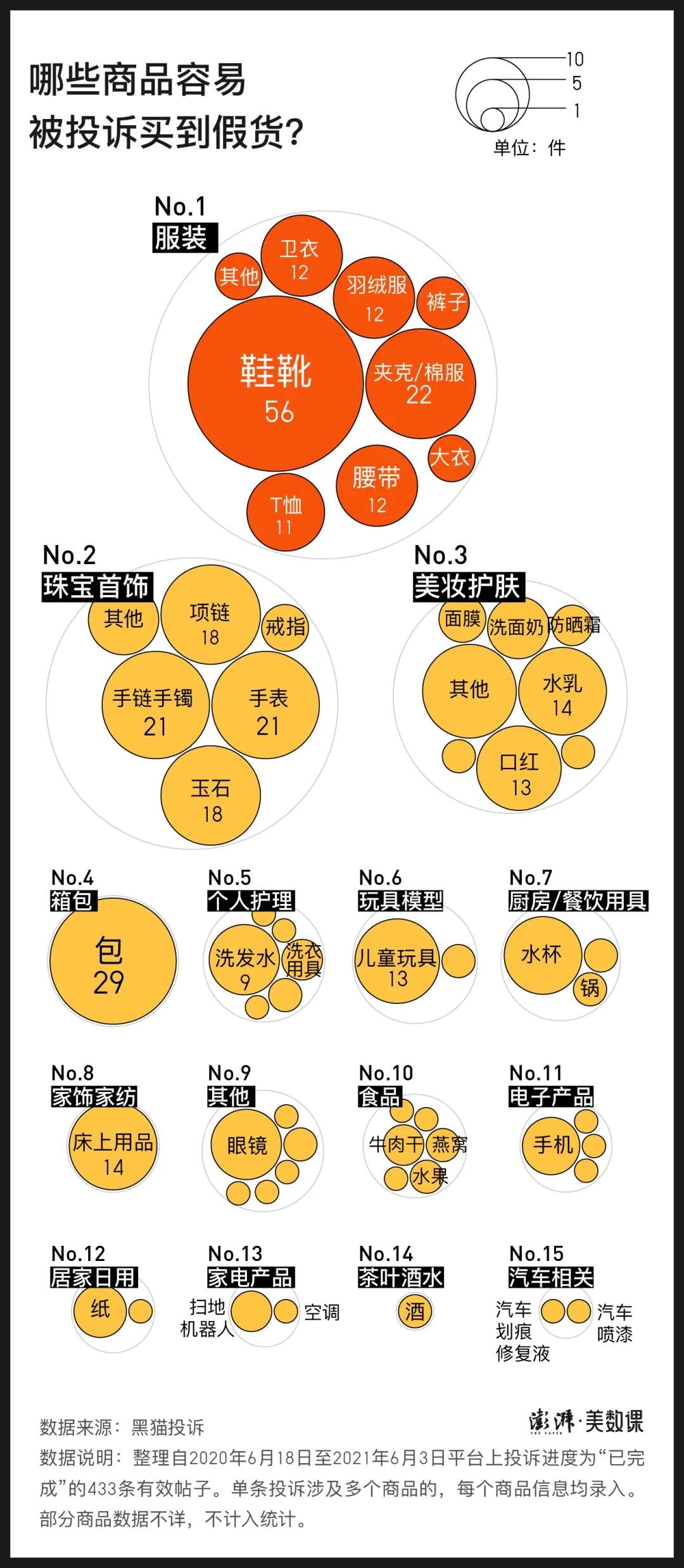 在直播间买什么东西更可能遇上假货?澎湃新闻收集了2020年6月18日至2021年6月3日期间,通过黑猫投诉平台发布的直播间售假投诉帖,并对其中投诉进度为“已完成”的433条,进行了分析(进度为“已回复”、“处理中”的帖子未纳入统计)。