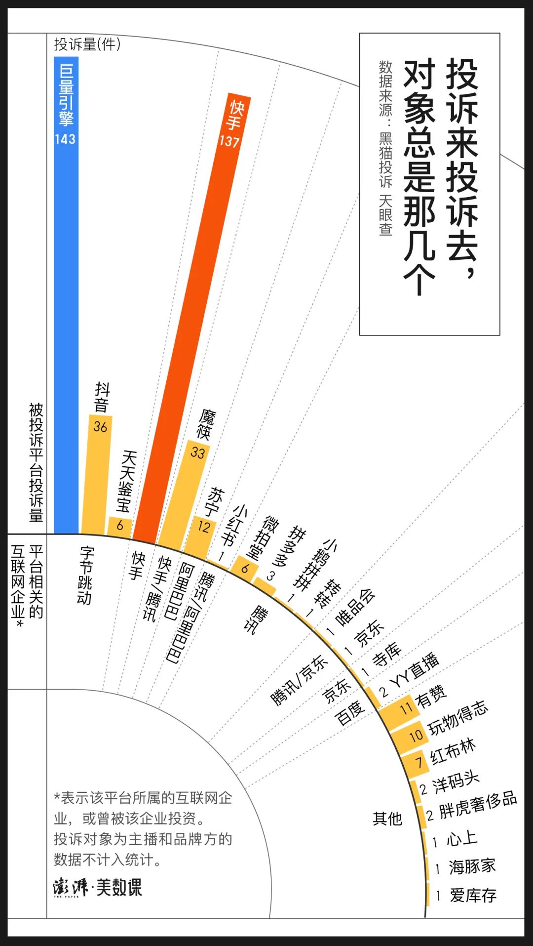 在澎湃新闻整理的433件投诉中,419件以平台为投诉对象,其中与字节跳动相关的共有185件,占比约44.2%。字节跳动旗下的官方营销服务品牌巨量引擎,被投诉量最高,共143件。
