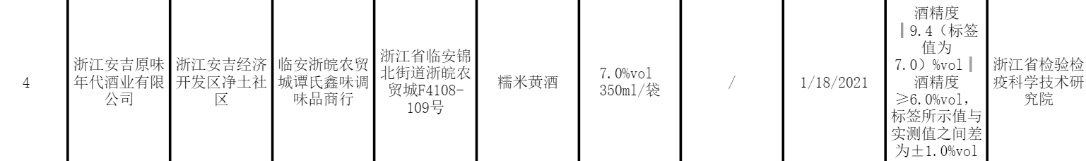 通告显示,临安浙皖农贸城谭氏鑫味调味品商行销售的标称浙江安吉原味年代酒业有限公司生产的一批次糯米黄酒,酒精度不符合产品明示标准及质量要求。检验机构为浙江省检验检疫科学技术研究院。