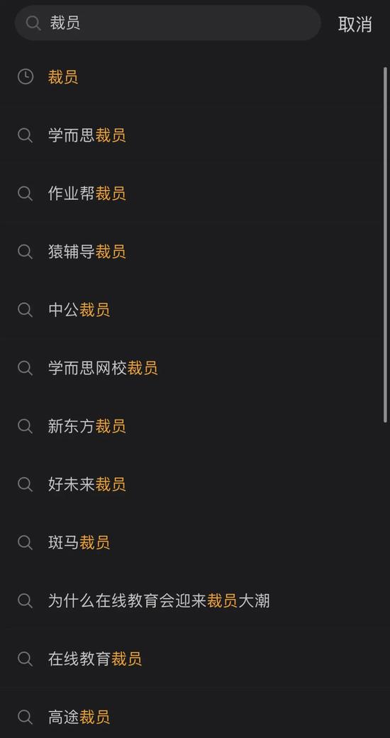 裁员的信息在5月开始席卷整个在线教育行业。一张被广为传播的图片,显示的即是在微博上打入“裁员”两字,跟随出现的是各大在线教育公司。