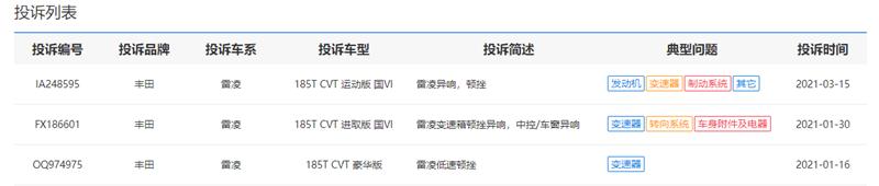 2019款雷凌185T CVT车型也因CVT变速箱顿挫、异响遭到不少消费者投诉,中国网投诉平台在今年上半年就接到了共计3起投诉案例。同时,该问题也引发了雷凌车主们的强烈抱怨。