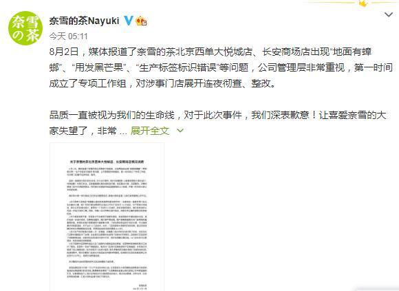 8月2日,媒体报道了奈雪的茶北京西单大悦城店、长安商场店出现“地面有蟑螂”、“用发黑芒果”、“生产标签标识错误”等问题,公司管理层非常重视,第一时间成立了专项工作组,对涉事门店展开连夜彻查、整改。