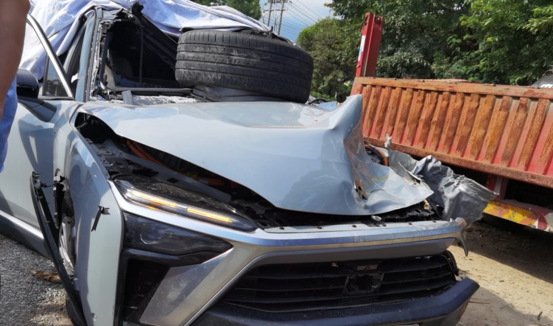 据其提供的车祸事故现场的照片显示,车辆损毁严重,A柱损毁、发动机盖完全掀起、顶棚发生严重挤压变形、车辆左前和驾驶位车门变形严重,疑似高速撞击所导致。