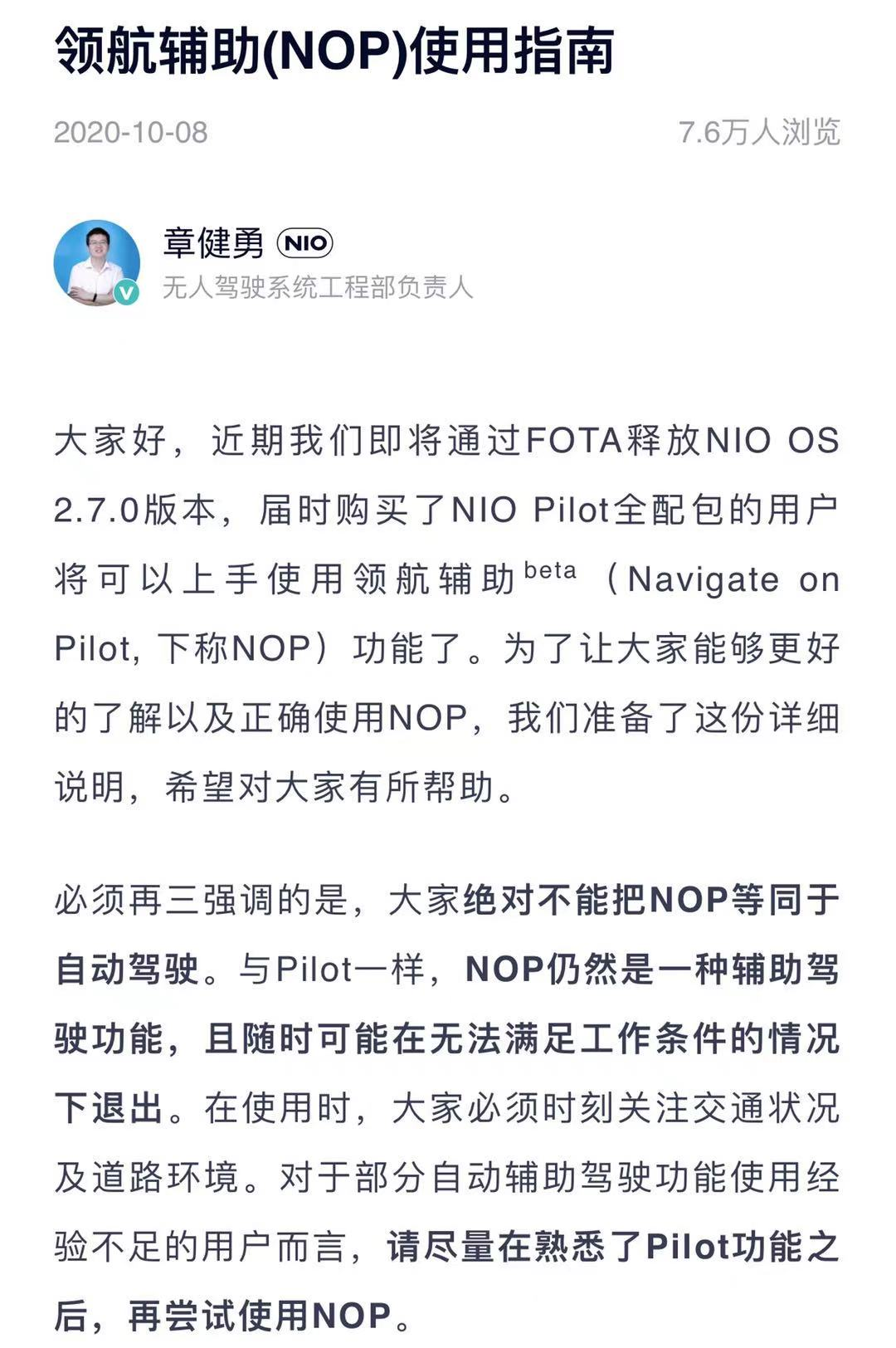 同时,据蔚来官方APP显示,章健勇指出,不能把NOP等同于自动驾驶。与Pilot一样,NOP仍是一种辅助驾驶功能,且随时可能在无法满足工作条件的情况下退出。在使用时,驾驶员需时刻关注交通状况及道路环境。