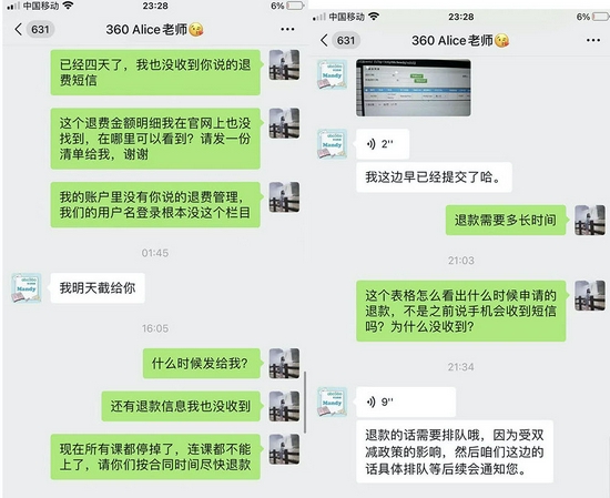 面对反复不一的说法,邵女士联系Tina想要退费,但对方始终没有正面回应。邵女士说,实际上,她在注意到“双减”政策的相关信息后,就曾表示希望退费,却被告知“课程已经过了退款有效期(3个月)”,因此无法申请退款。