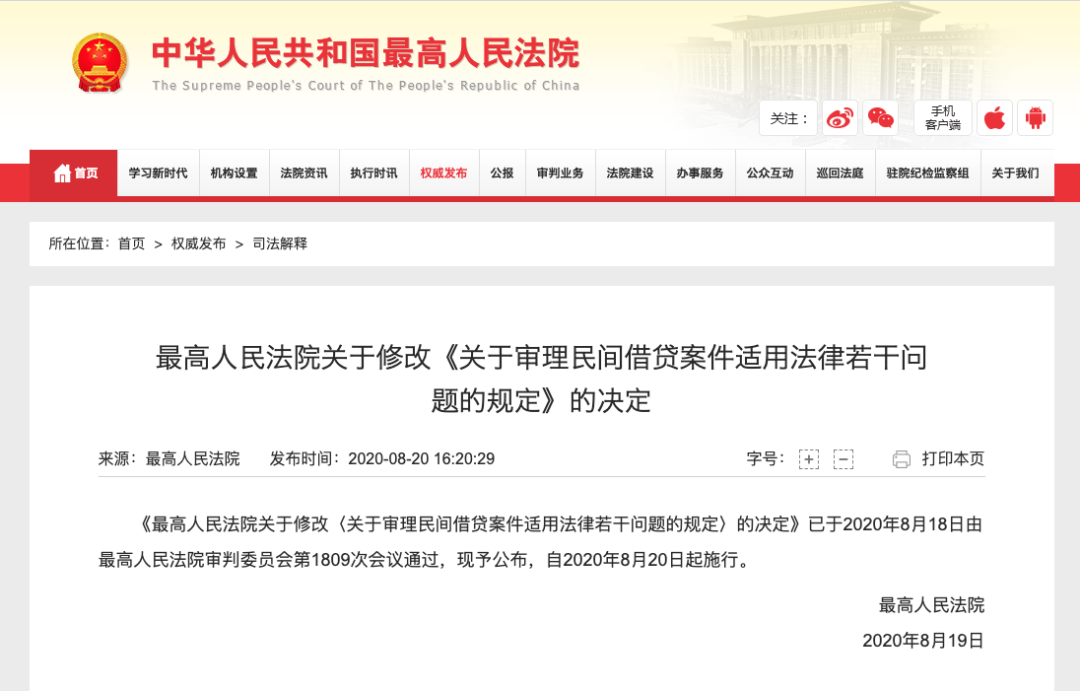 8月20日,最高人民法院举行新闻发布会,正式发布新修订的《最高人民法院关于审理民间借贷案件适用法律若干问题的规定》。