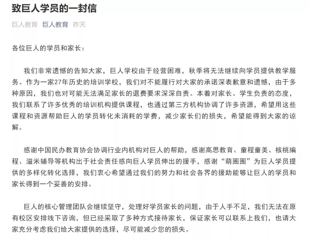 8月31日,老牌校外培训机构巨人教育在官方微信公众号发布《致巨人学员的一封信》,信中称巨人学校由于经营困难,秋季将无法继续向学员提供教学服务。