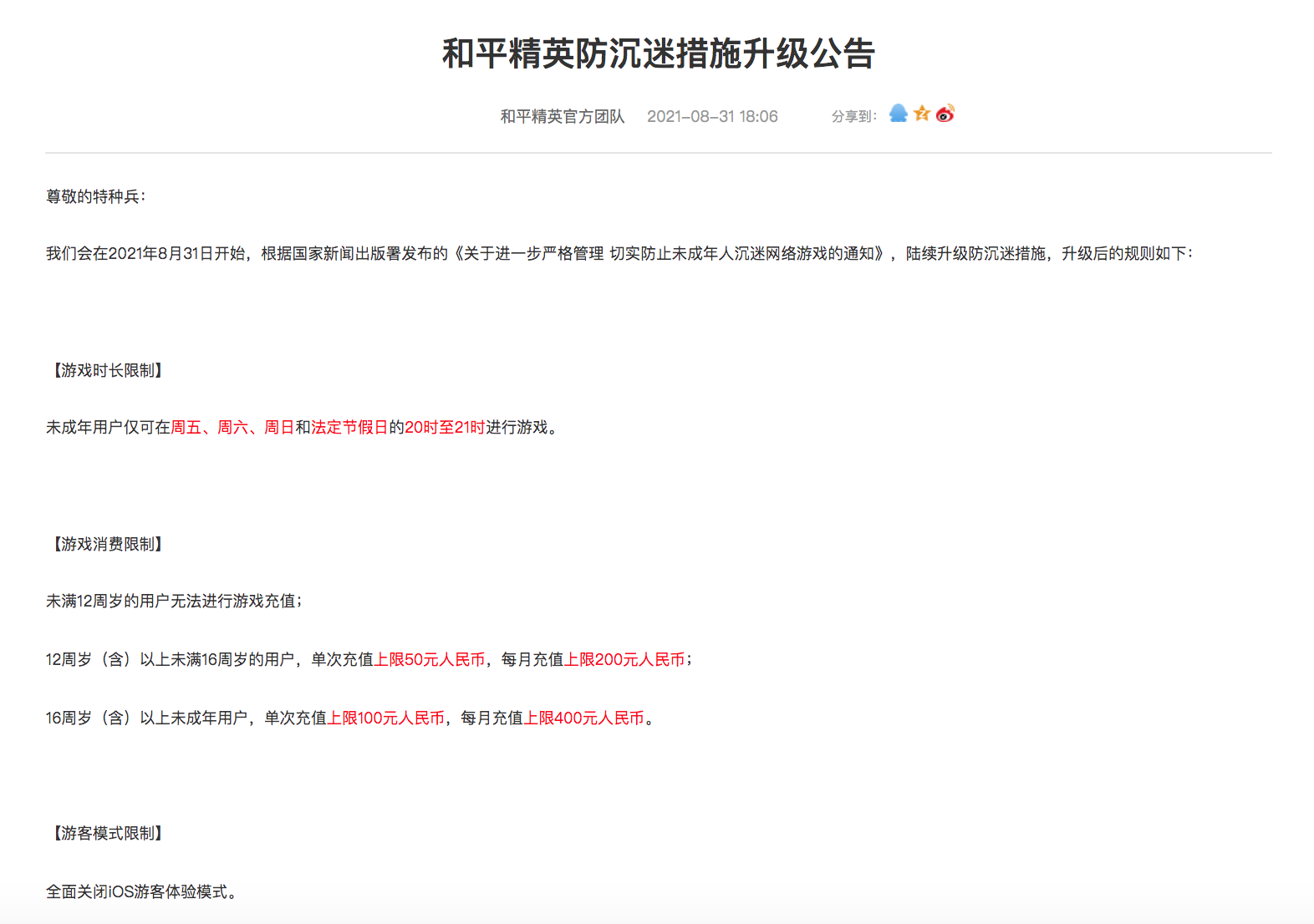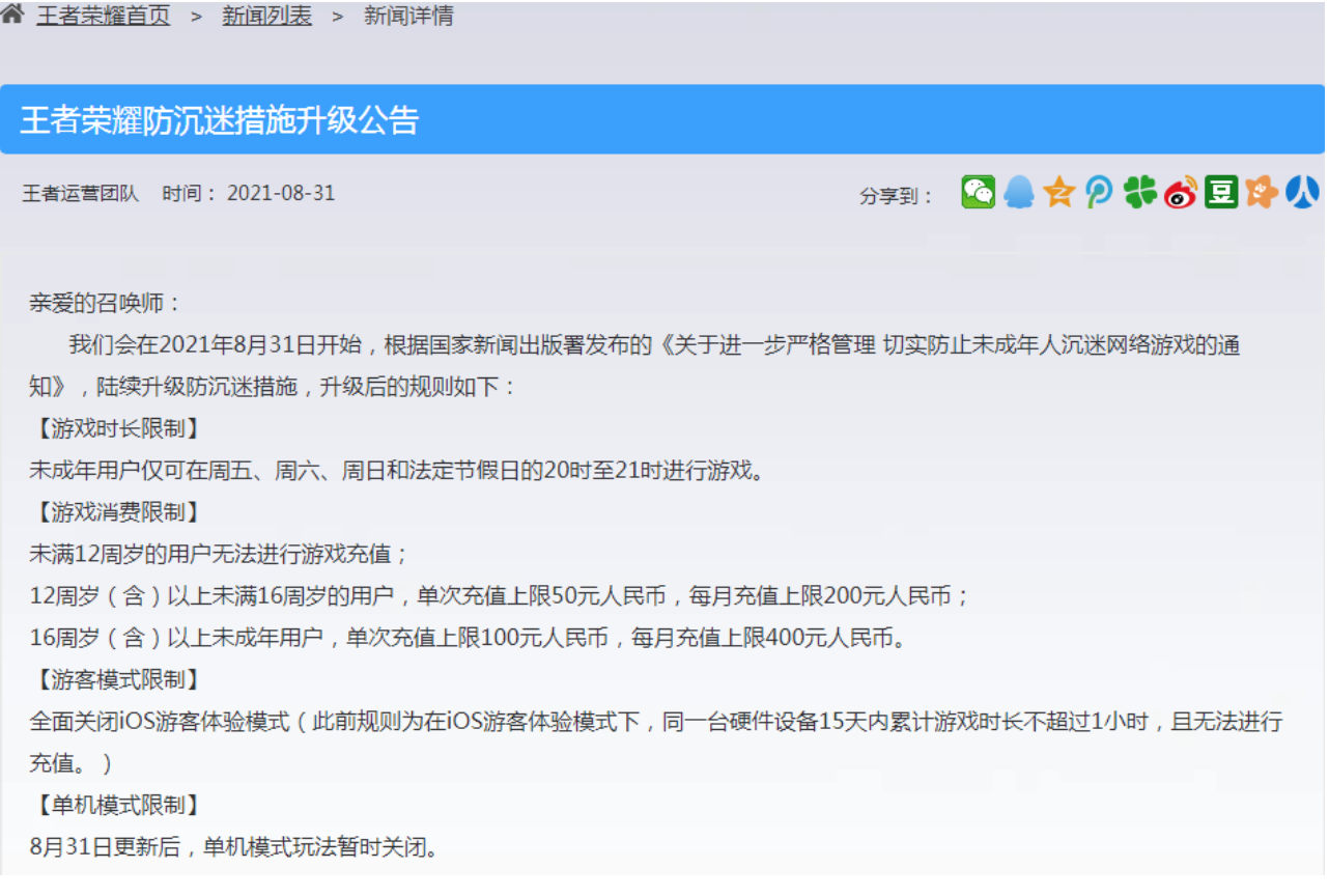 8月31日,《王者荣耀》在其官网发布公告称,会根据国家新闻出版署发布的《关于进一步严格管理切实防止未成年人沉迷网络游戏的通知》,陆续升级防沉迷措施。在游戏时长限制方面,未成年用户仅可在周五、周六、周日和法定节假日的20时至21时进行游戏。