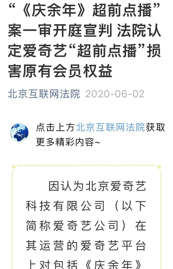 超前点播本身是合法的。2020年法院在《庆余年》超前点播案中已做出终审判决,认为超前点播是“商业模式的探索,本身不违反法律规定”。这一表态被多个视频平台当作超前点播的正当性依据广泛传播,堵了消费者的嘴。