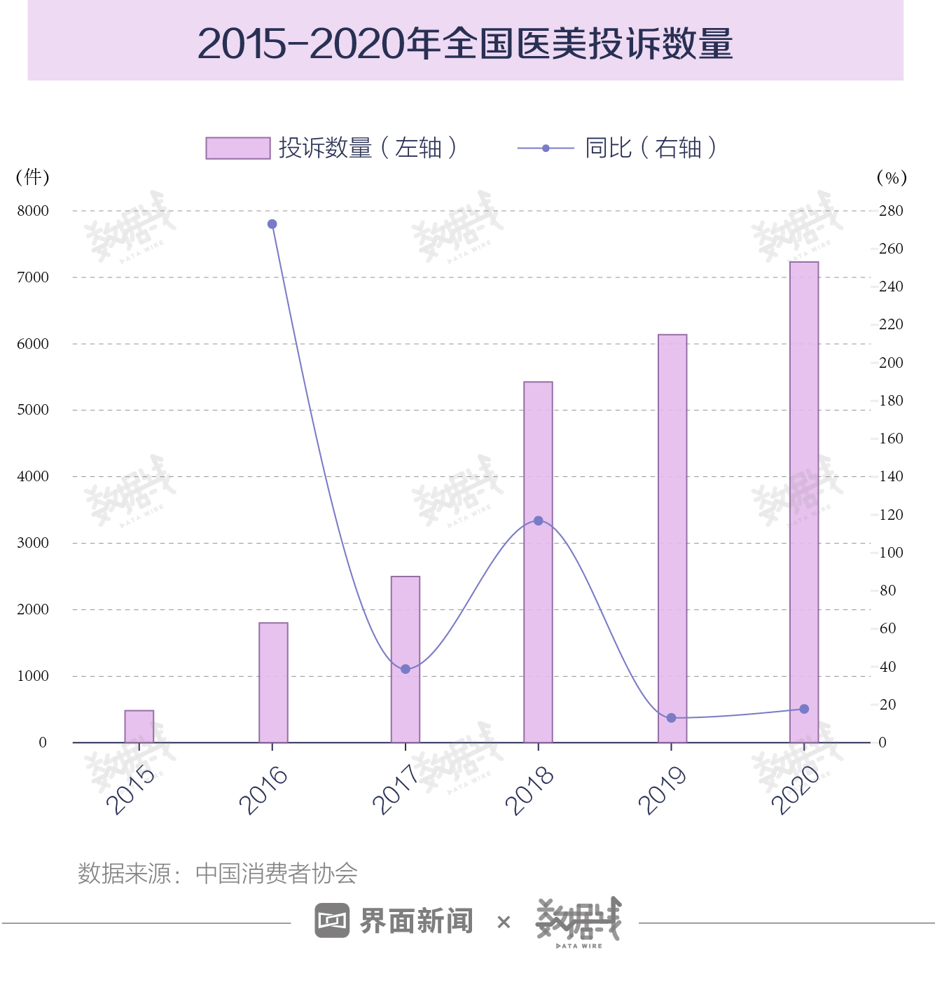 据中国消费者协会官网数据,2015年至2020年,全国医美投诉数量从不足1千件增长至超7千件,连续5年增长14倍。