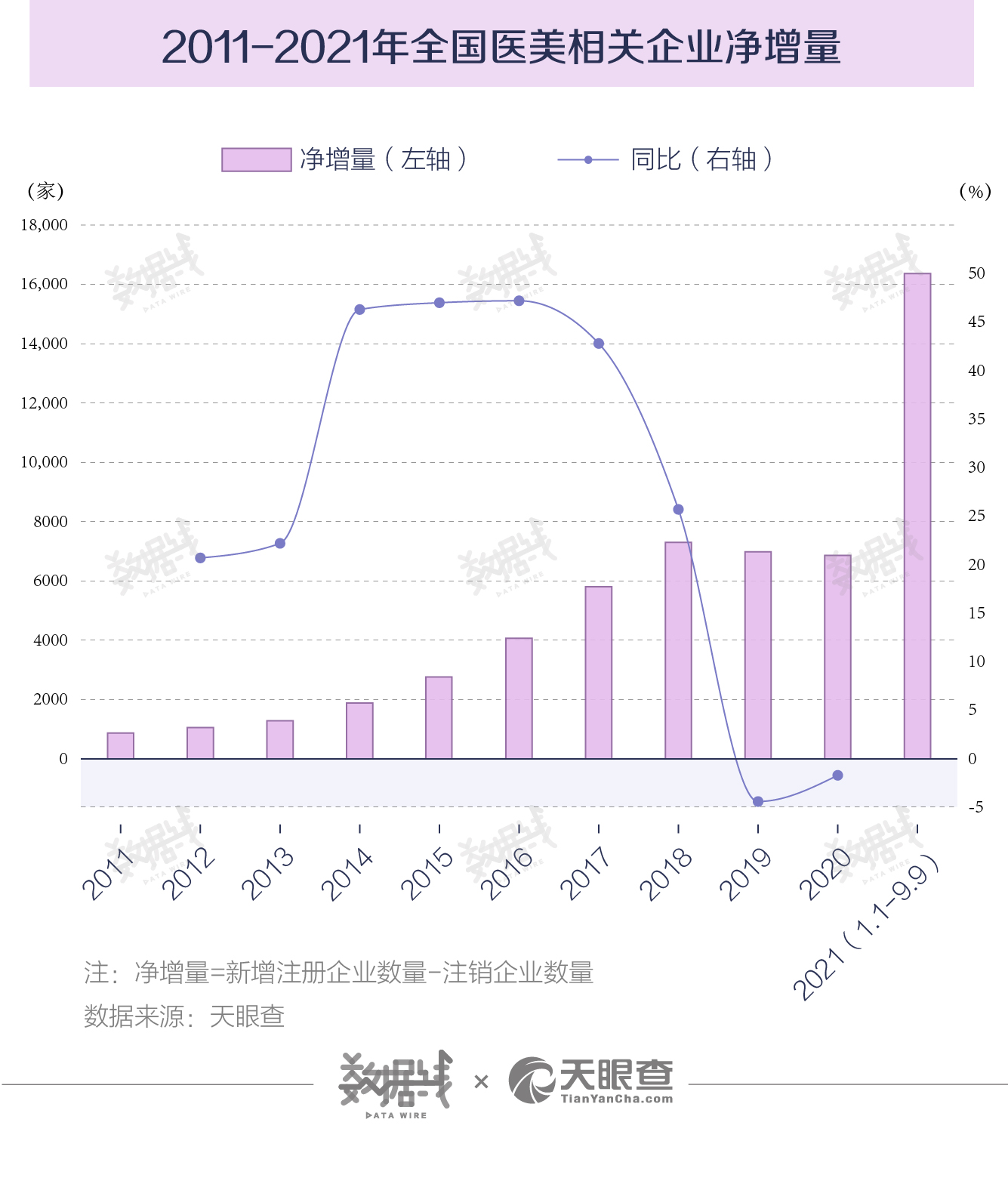 监管之下,医美企业入局情况如何?据天眼查数据,2018年至2020年,全国医美相关企业净增量连续两年下降。但今年以来,医美相关企业出现大幅增加。截至2021年9月9日,全国医美相关企业净增约1.6万家,是2020年全年数据的两倍多。