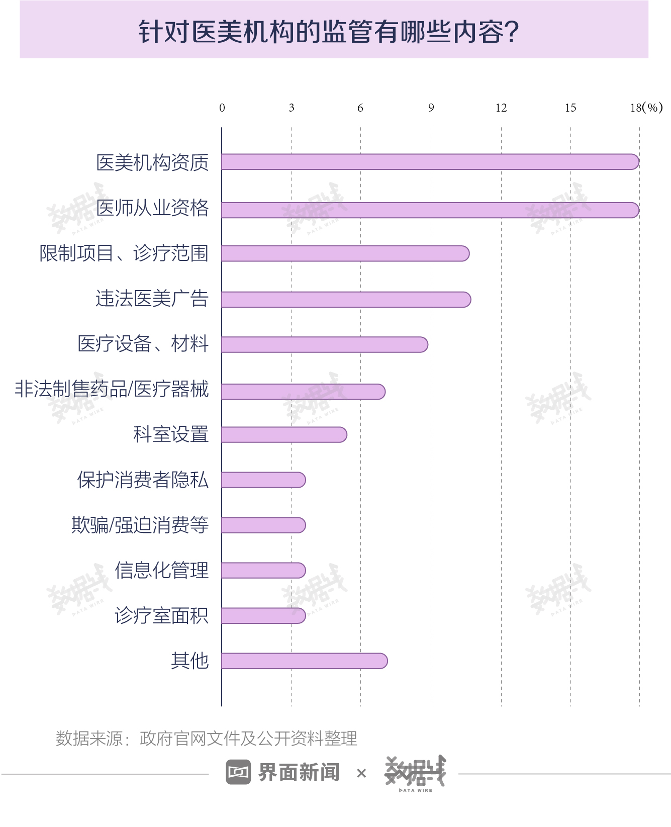 据界面数据不完全统计,1994年至2021年,国家和各监管机构针对医美行业的监管政策文件至少达12份。其中,针对“医美机构资质”和“医师从业资格”的监管分别占近两成。“限制项目、诊疗范围”和“违法医美广告”的管控分别占约1成。