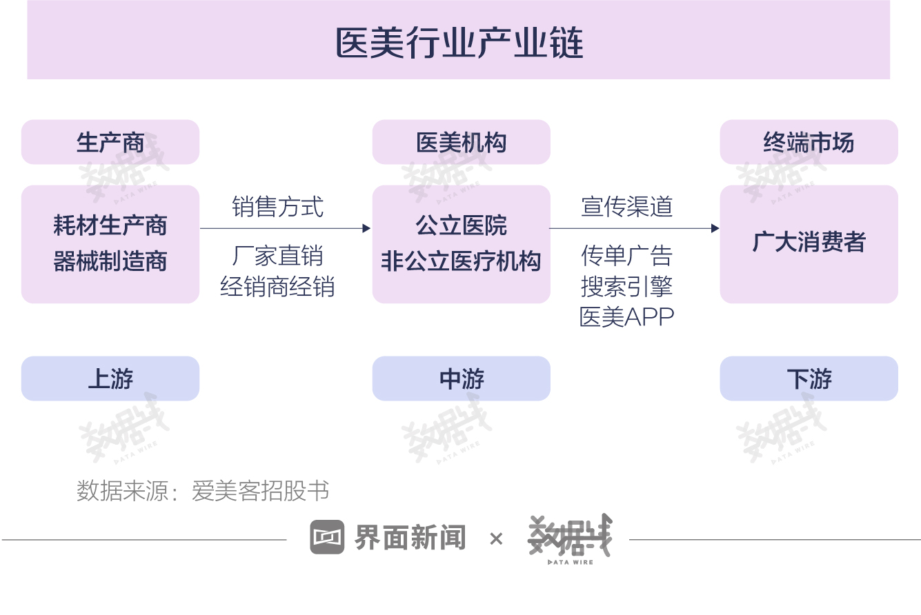 据爱美客招股书,医美行业产业链包括上游生产商、中游医美机构以及下游消费者。近年来,线上平台不断发展,医美APP成为新兴渠道。