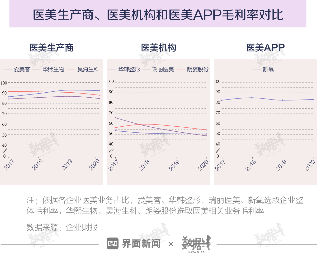 医美产业中,做手术的最不赚钱,医美APP其次,上游原材料生产商赚得最多。以注射医美行业为例,界面数据选取上游、中游及下游渠道环节的医美主要上市企业财报进行分析。2017年至2020年,爱美客、华熙生物、昊海生科3家上游医美生厂商的平均毛利率范围约在85%-90%之间,华韩整形、瑞丽医美、朗姿股份3家中游医美机构的平均毛利率范围约在50%-60%之间。4年间,医美APP新氧的毛利率始终在80%以上。