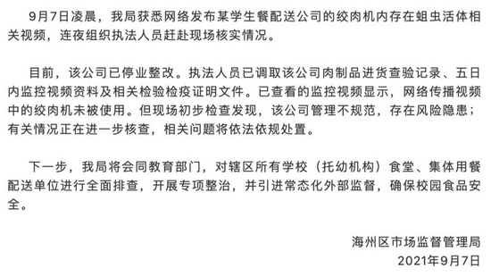 9月7日,连云港新海实验中学发布声明称,9月6日晚,该校与家委会代表联合现场考察学校中标配餐公司配送中心。现场考察过程中,发现该配送中心存在管理漏洞,个别长期闲置的食品加工设备疑似存在食品卫生问题。本着对学生食品安全健康高度负责的态度,学校立即暂停该公司的配餐服务,并向食品安全监管部门报告。目前,市场监督管理部门已经全面介入调查,学校将根据调查结果确定后续工作安排。