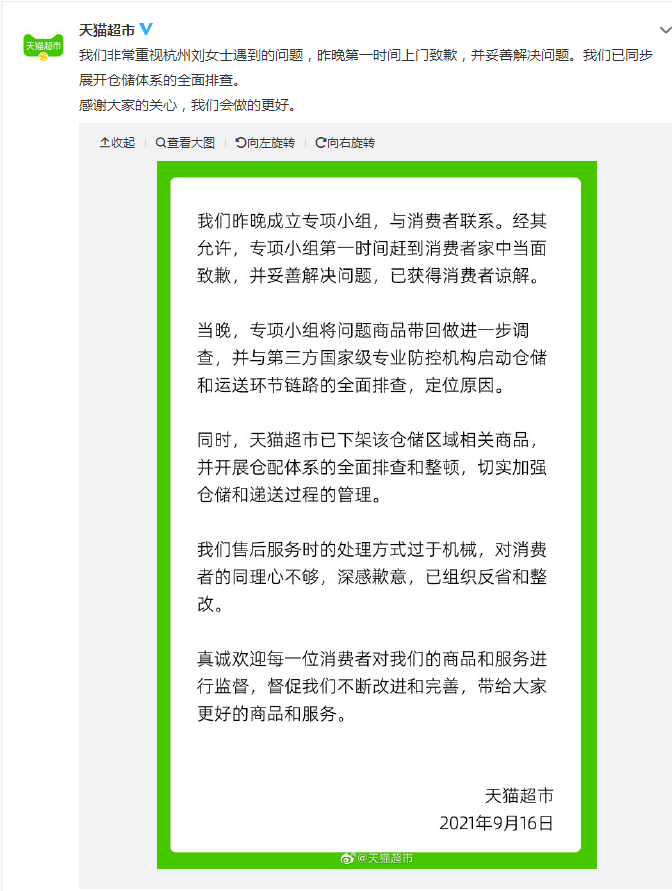 9月16日下午,天猫超市微博发声道歉:已成立专项小组与消费者联系,赶到消费者家中当面致歉,并已获得消费者谅解。