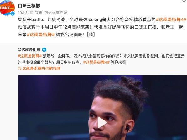 综艺节目《这就是街舞4》宣传。来源:@口味王槟榔官方微博