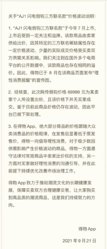 9月21日,得物App发布《关于“AJ1闪电倒钩三方联名款”价格波动说明》。说明中提到,经核查,此次网传倒钩价格69999元为某卖家个人所设置出价,且该价格下并无买家成交。鉴于目前此商品价格仍存在波动,因此平台已做下架处理。
