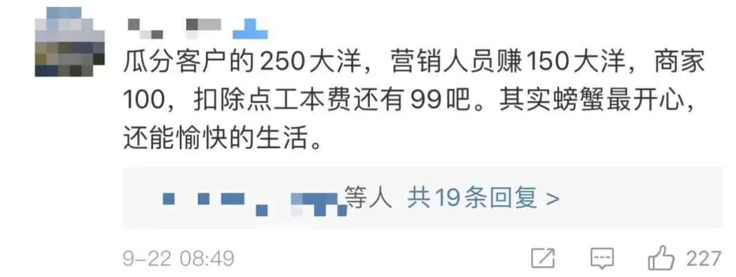 图片来源:黑猫投诉平台截图“螃蟹券无法兑付,螃蟹券炒作,缺斤少两,导致这些问题的根本原因不是螃蟹券形式,而是通过螃蟹券进行的螃蟹交易,没有很好的第三方来维护交易公平性,缺乏监管,没人管。电商买生鲜,不满意你还可以给个差评,但如果你是螃蟹券,不满意找谁?”在盘和林看来,螃蟹券真正的问题在于:商家利用螃蟹券,跳过了第三方,规避了螃蟹交付的义务。