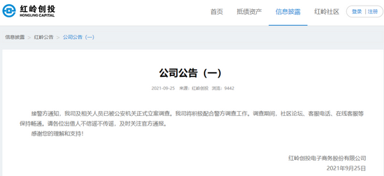另外,9月25日,红岭创投电子商务股份有限公司也在其官网公告称,“接警方通知,我司及相关人员已被公安机关正式立案调查。我司将积极配合警方调查工作。调查期间,社区论坛、客服电话、在线客服等保持畅通。请各位出借人不信谣不传谣,及时关注官方通报。”
