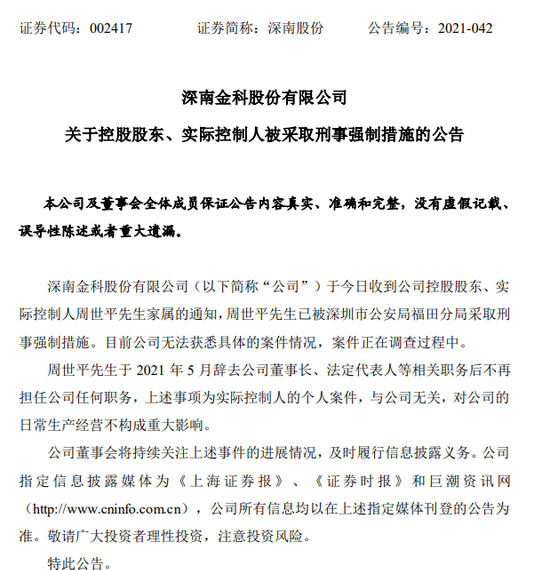7月22日的时候,上市公司深南股份发布公告,周世平先生被深圳市公安局福田分局采取刑事强制措施。目前公司无法获悉具体的案件情况,案件正在调查过程中。