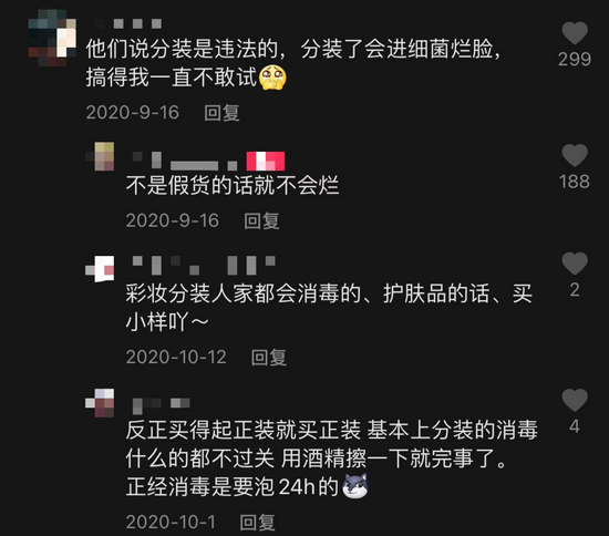 对此商家回应称,在之后的分装工作上会更加用心。“分装小样一打开就有浓浓的酒精味,怕刺激皮肤就没敢用。”美妆爱好者丹丹(化名)也表达了对化妆品分装产品卫生问题的担忧。