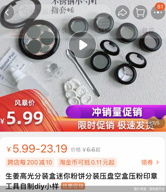 在淘宝上,一个月销900+的店铺“白鹿DIY手作”销售的高光分装盒迷你粉饼分装压盘,其售价可低至5.99元。5个单格铁盒、1个三分格铝盘、30毫升医用酒精、1个压粉章、1个不锈钢小勺和6个指套售价为23.19元。当然,价格还可以更低,分装化妆品的包装盒按容量的不同一般在3-8毛之间不等,购买数量越多相对价格也更便宜。