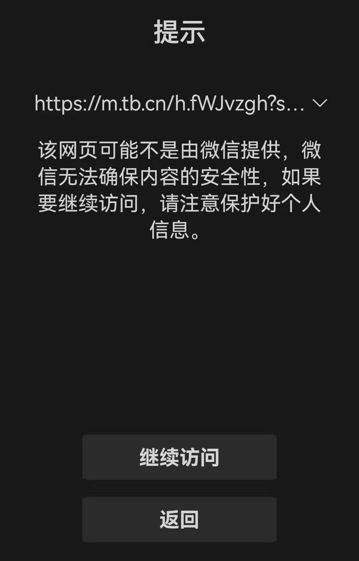 以核心社交软件微信为例,9月29日,澎湃新闻记者通过微信的一对一群聊分享淘宝链接时,会出现一个跳转页面,点击“继续访问”后才能打开链接。虽然链接可以打开,显示的却是乱码。