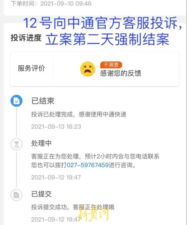 张华在9月12日、9月13日,先后两次向中通快递公司客服投诉此事,但她发现自己的两次投诉在均未得到回应时,却都显示已经处理完成。随后她又通过12305申诉小程序反映,但依然未收到中通快递的正面回复。9月29日下午,张华再次联系了中通快递客服,客服回应“仍在调查核实”。