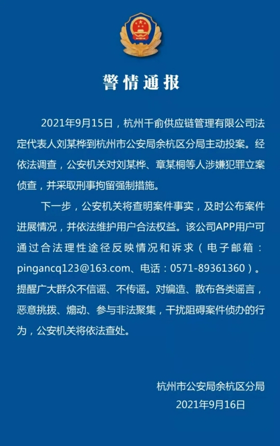 据杭州市公安局余杭区分局的警情通报,公安机关目前已经对杭州千俞供应链管理有限公司的法定代表人刘某桦、章某桐等人涉嫌犯罪立案侦查,并采取刑事拘留强制措施。