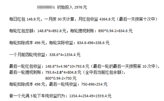 记者潜伏该平台内部群,在群内有这样一个收益测算案例:假设一个投资者每轮都在上述49、99、149和199专区进行拼团,其一轮的成本为496元。那么一轮6天,每天可以获得红包奖励148.8元,六天的累计收入为892.8元,扣除6%和2元的提现手续费后,净收入为834.6元。净收入减去投入的成本496元后得到净收益338.6元,一个月五轮完整的收益为1559.4至1851.2元之间。换句话说,该平台投资者的月预期回报率超50%。