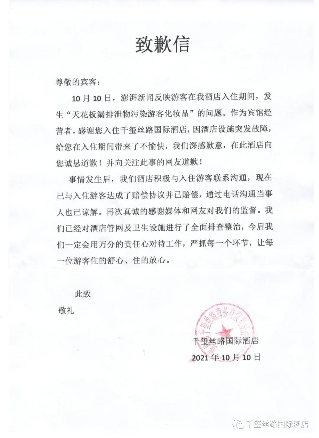 致歉信称:10月10日,澎湃新闻反映游客在我酒店入住期间,发生“天花板漏排泄物污染游客化妆品”的问题。作为宾馆经营者,感谢您入住千玺丝路国际酒店,因酒店设施突发故障给您在入住期间带来了不愉快,我们深感歉意,在此酒店向您诚恳道歉!并向关注此事的网友道歉!