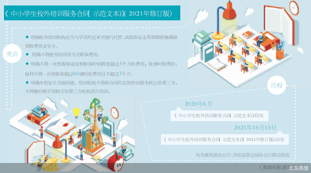 在对收费时间的约束上,《服务合同(示范文本)》要求机构需按照国家有关政策要求,不得一次性收取或变相收取时间跨度超过3个月的费用;按课时收费的,每科不得一次性收取超过60课时的费用且不超过3个月。