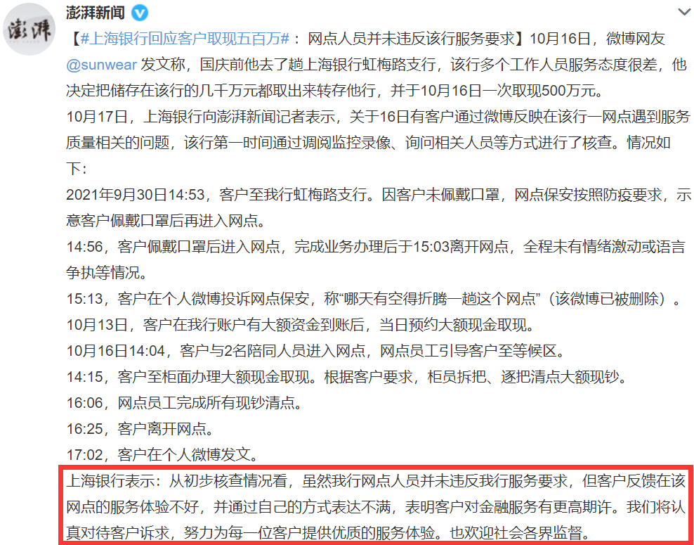 对此,10月17日,据相关媒体报道称,上海银行表示第一时间通过调阅监控录像、询问相关人员等方式进行了核查。上海银行指出,“从初步核查情况看,虽然上海银行网点人员并未违反上海银行服务要求,但客户反馈在该网点的服务体验不好,并通过自己的方式表达不满,表明客户对金融服务有更高期许。