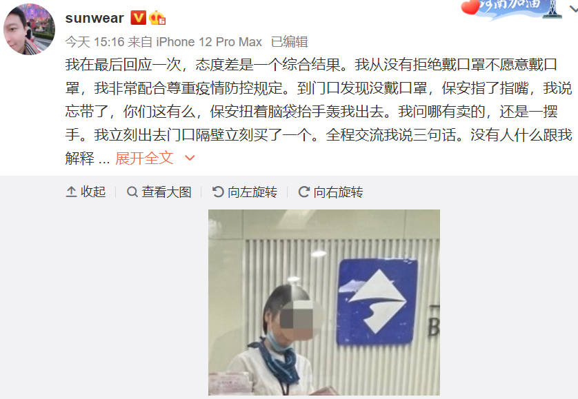 上述“凡尔赛”式言论发布后,一度引发网友围观,并在10月16日冲上微博热搜榜。10月17日下午15时16分,@sunwear再次发布最后回应称,“我不需要什么高人一等的服务对待,不需要VVIP,只需要最基本的礼貌和尊重” 。
