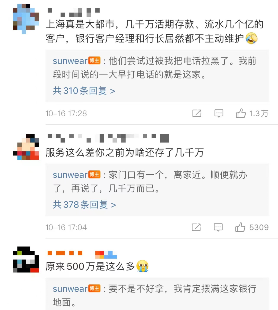 10月16日,微博大V@sunwear发文炮轰上海银行虹梅路支行称,该支行为服务态度最差的银行,决定转走该行数千万元存款后进行销户。据@sunwear发布的微博信息,其在国庆节前夕去了一趟上海银行虹梅路支行,但该支行的服务态度却让他不能接受。