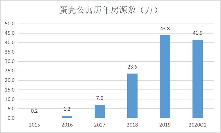 2015年年底,成立一年的蛋壳公寓的房源数量只有2000多间;2016年年底达到12000间;2017年年底做到7万间;2018年全年房源为23.6万;2019年全年同比增长85.4%至43.8万套;2020年一季度,这一数据下降至41.5万套。