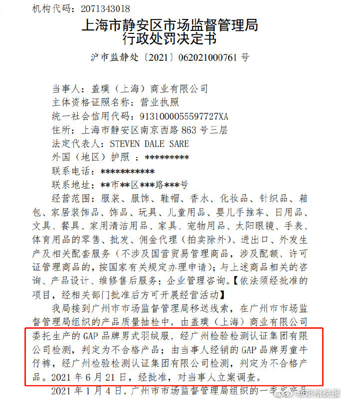 【#GAP因服装以次充好被罚45万# 涉及童装及羽绒服】天眼查App显示,近日,GAP关联公司盖璞(上海)商业有限公司新增一则行政处罚信息,因其生产、销售以不合格产品冒充合格产品被上海市静安区市场监督管理局没收违法所得5.570425万元,罚款39.664991万元,共计约45万元。