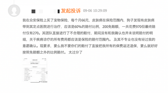 另一位消费者的投诉信息显示,其宠物狗治疗皮肤病花费了970元,其购买的保险产品免赔额是200元,赔付比例是60%,但自己只获赔了270元,相关赔付明细也并没有说明。