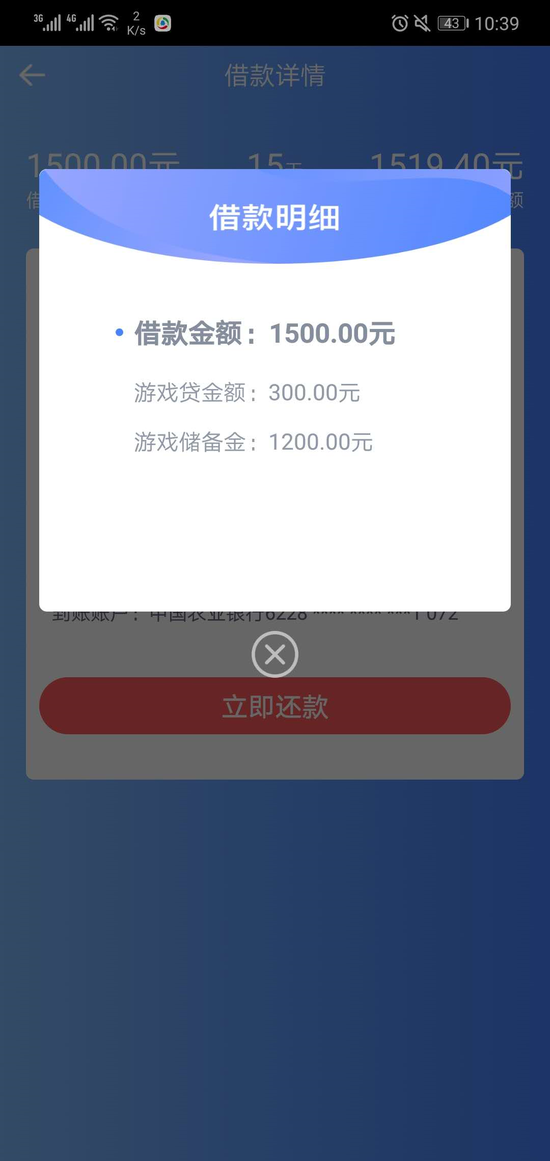 而另一部分叫做“游戏储备金”,则是用户实际到手的款项金额。从姜女士提供的截图来看,其实际到手只有1200元。通过计算可得,该笔贷款的实际年化利率高达647.67%。