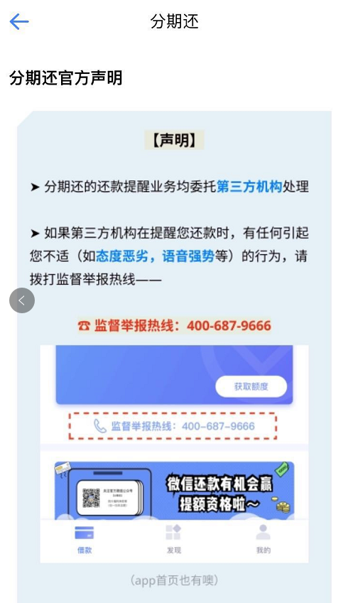 新浪金融曝光台同时注意到,“分期还”APP目前在首页位置开设了一个“监督举报”栏目,平台还发布公告称,其所有还款催收业务均外包给了第三方机构处理,如果第三方机构在催收时存在态度恶劣等问题,用户可拨打监督举报热线进行维权投诉。