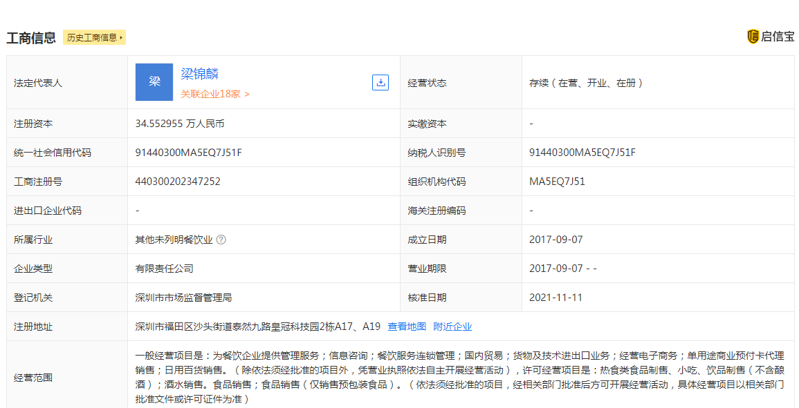 据企信宝,“野萃山”关联公司深圳市豪麟餐饮有限公司成立于2017年9月,注册资本约34.55万人民币,法定代表人为梁锦麟。经营范围包括热食类食品制售、小吃、饮品制售;酒水销售等。