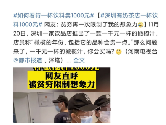据中国经济周刊,近日,深圳一家野萃山饮品店推出一款一千元一杯的橄榄汁,引发网友热议。涉事店铺回应称:不是奶茶,是橄榄汁,进价就要800多元一斤,制作需要3个小时等。
