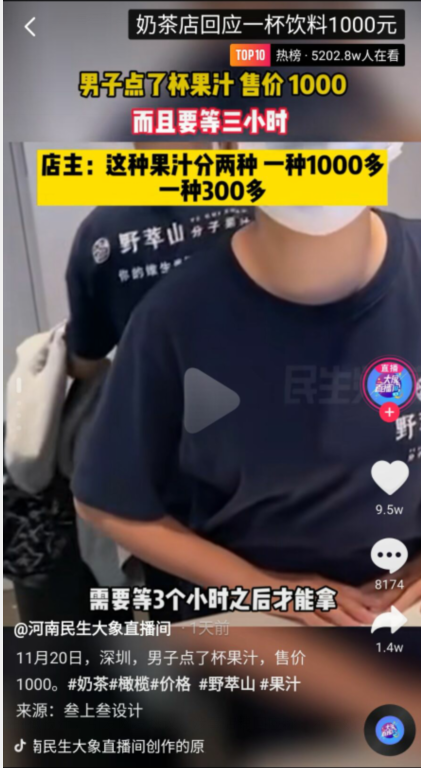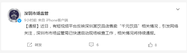 原标题:1000元一杯饮品引网友热议,背后大股东是这家公司!深圳市监局最新通报:已快速启动现场核查