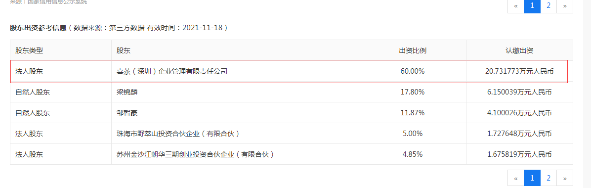 变更记录显示,喜茶(深圳)企业管理有限责任公司投资入股该公司,持股比例60%,成为“野萃山”第一大股东。
